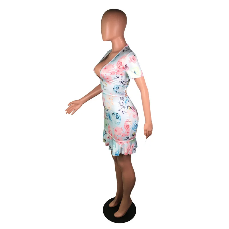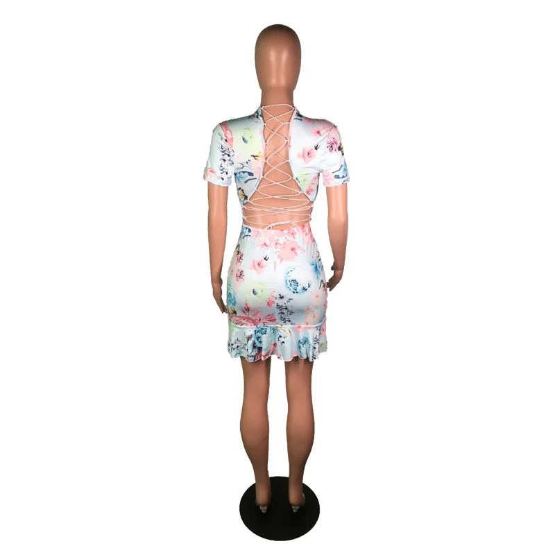 SKMY Mulheres Vestuário Moda Vestido Floral Sexy Com Decote Em V Lace-Up Backless Manga Curta Imprimir Babados Bodycon Mini Vestido Desgaste Do Partido