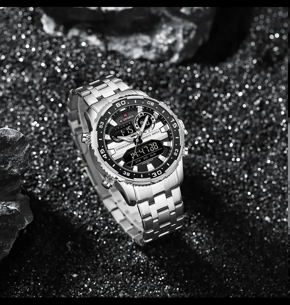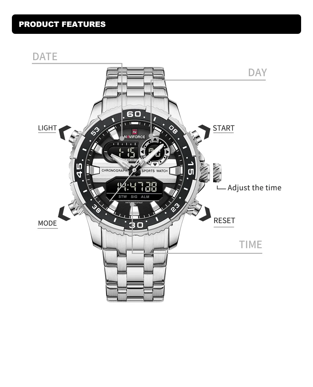 Feature: 30M Water Resistant, Day?Date?Dual Time Display, Alarm, Chronograph, Luminous