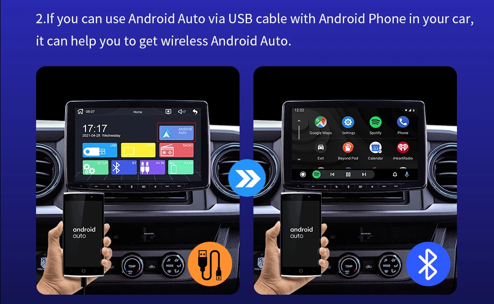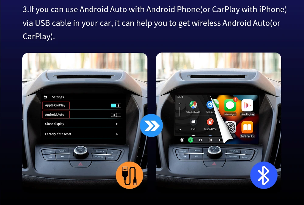 Aviso 1: comprove que você pode usar a função CarPlay com telefone IOS ou função Android Auto com telefone Android por cabo USB, se você não puder usar, por favor NÃO compre, ele NÃO cabe.