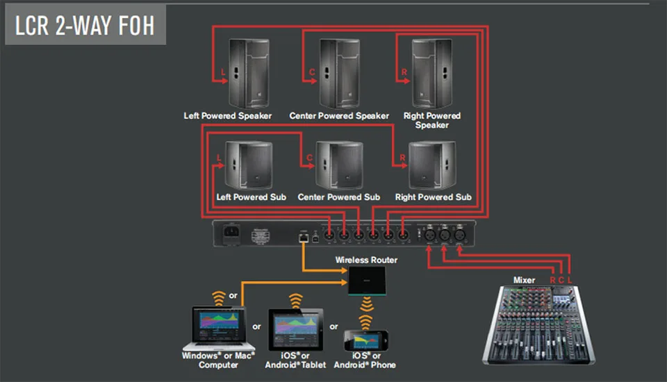 • Suporte para configurações de subentrada multi-mono, estéreo, LCR e Aux-Fed