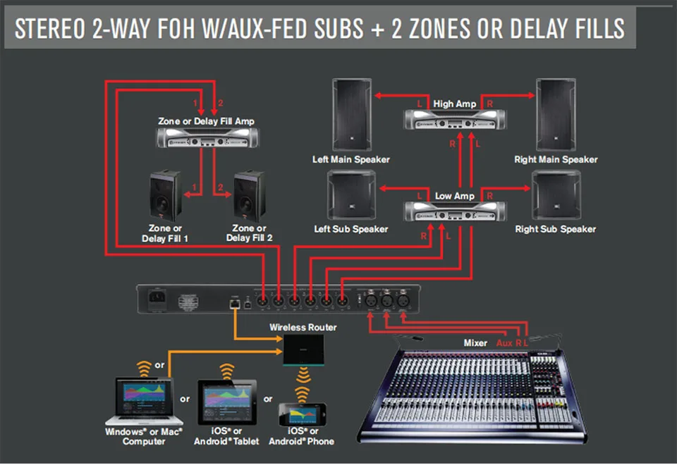 • Crossover com suporte para configurações de alcance total até configurações mono de 6 vias