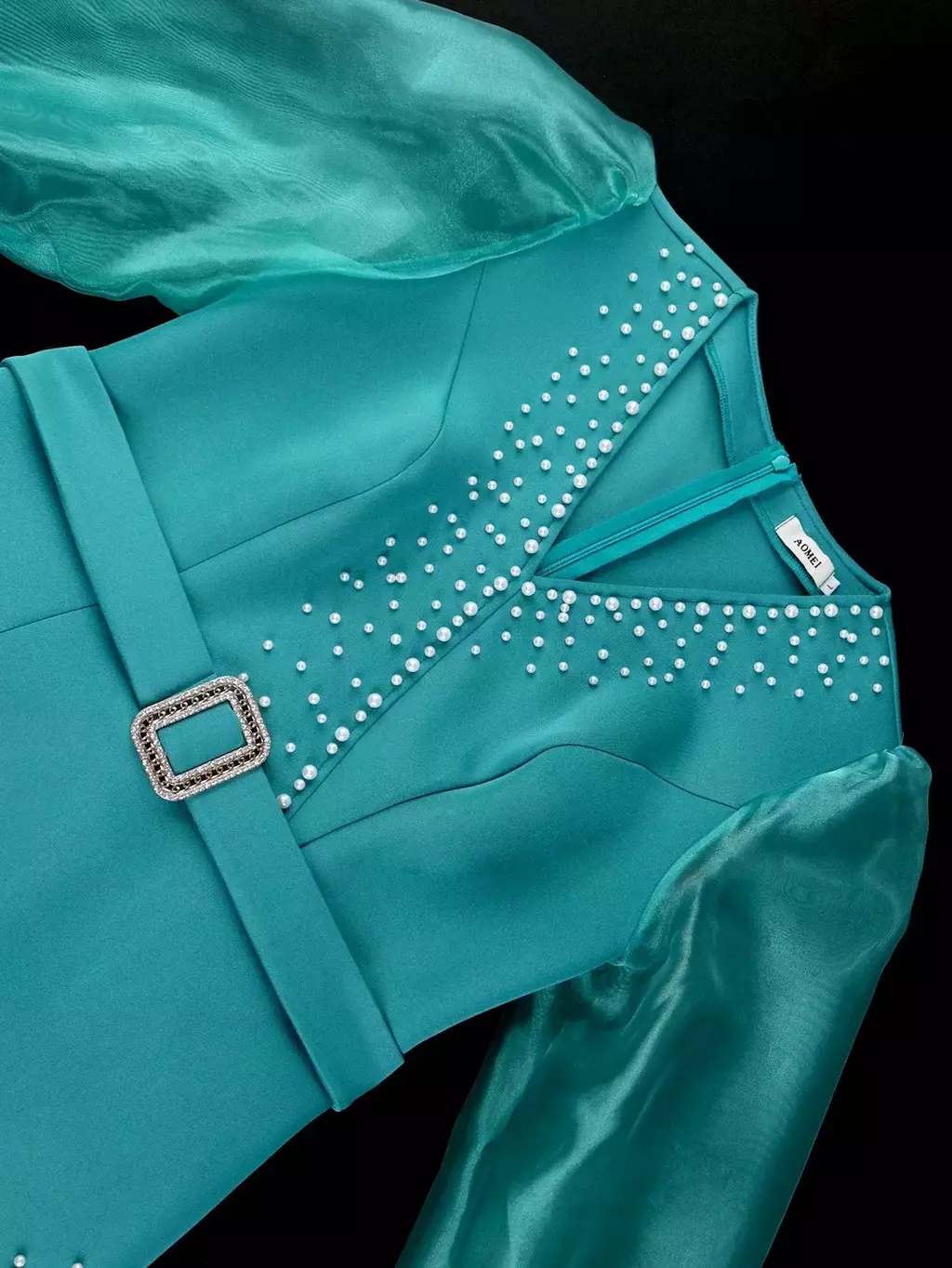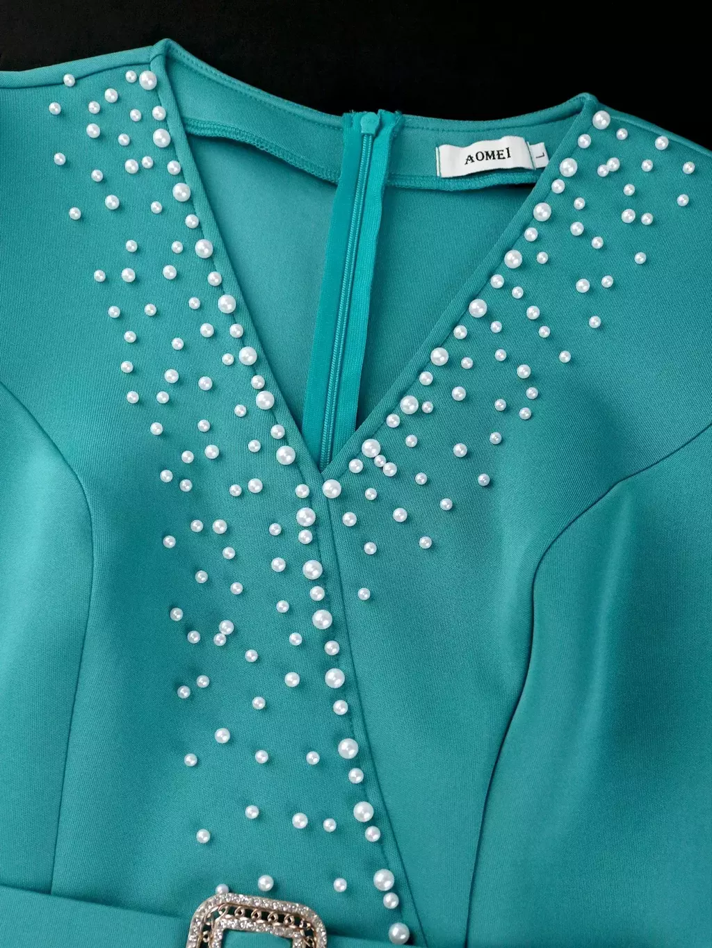 A peça apresenta silhueta tubinho com caimento regular, que valoriza as curvas com equilíbrio. Possui decote em V, mangas bufantes e detalhe em patchwork com miçangas, criando um visual diferenciado e de alto estilo. O comprimento até a canela oferece um toque de elegância adicional, ideal para todas as estações do ano.